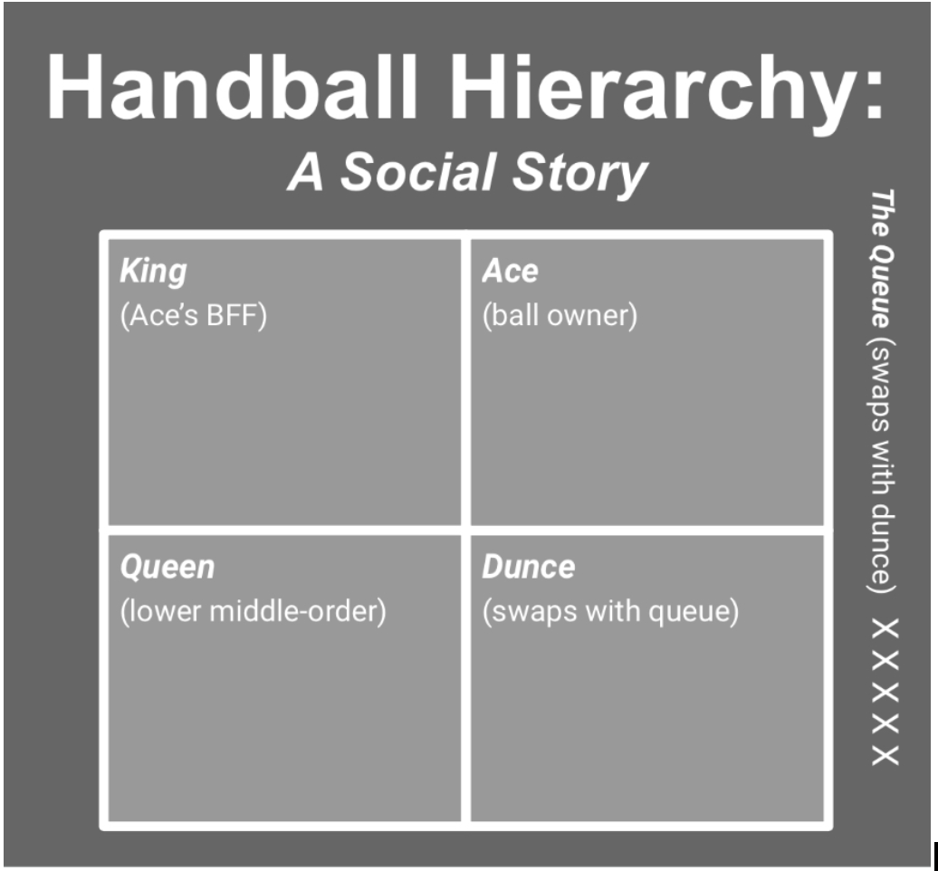 The playing positions represent social standing. Ace is for the top dog, often the kid who owns the ball and manages to keep changing the rules to remain in the dominant position. More like a pack of cards than royal hierarchy, the King and Queen are mid-range social climbers, naively hoping to dethrone the person in Ace. It is common to find players rotating between the bottom of the barrel dunce and reserve positions, either due to lack of skill or a passive approach to the constant rule changes.